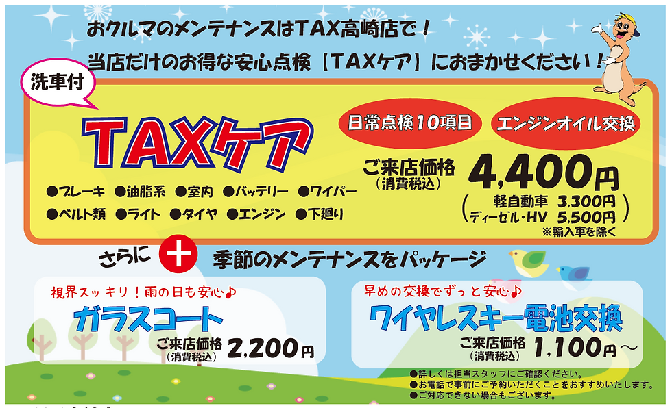 TAX高崎店からのご案内:オイル交換+「TAXケア」